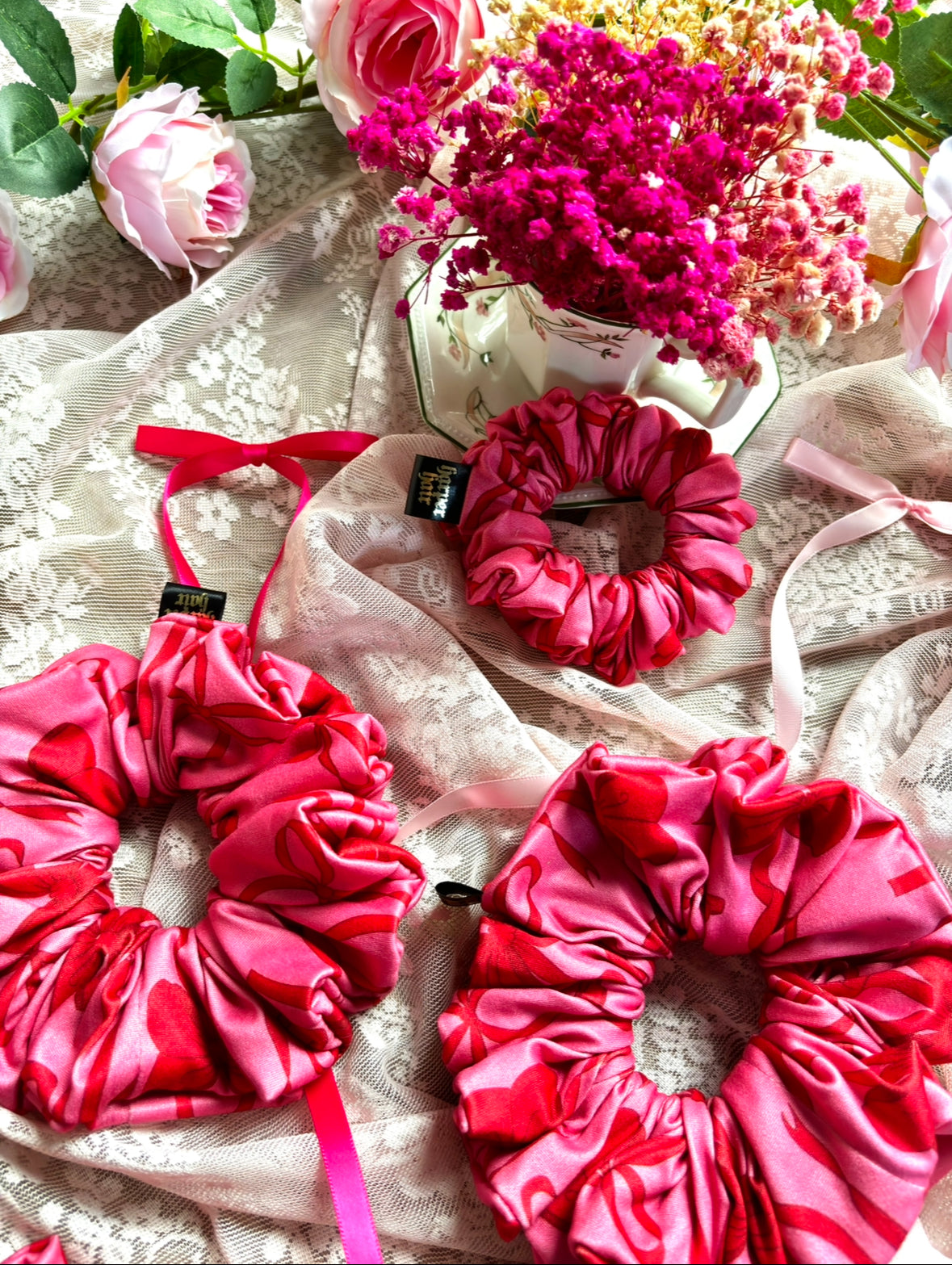 Every scrunchie is lovingly handmade by me and my dad, stitched with care and sprinkled with charm. Together, we select soft fabrics, vintage-inspired prints, and delicate textures that capture our girly, dreamy aesthetic. Each piece is crafted not just as a hair accessory, but as a keepsake to be cherished.